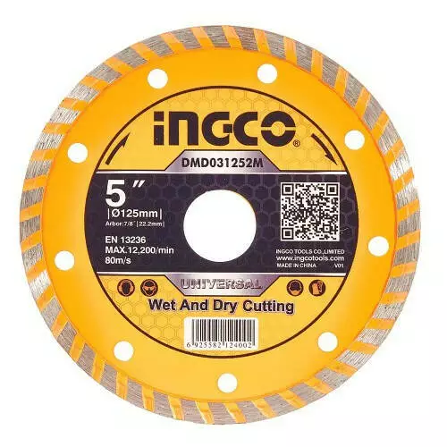 Диск алмазний відрізний INGCO DMD031252M діаметром 125 мм — чудовий різальний елемент для кутової шліфувальної машини. Призначений для сухого та мокрого різання бетону, цегли, натурального і штучного каменю. Скошені грані забезпечують високу швидкість різання, підвищену продуктивність інструменту. Оснащення відповідає стандарту EN13236.