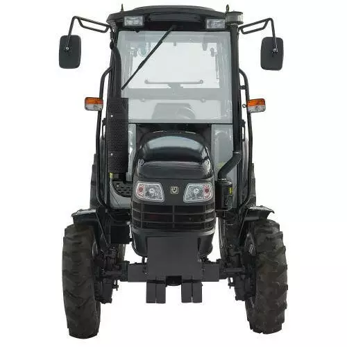 Кабина с панорамным склеиванием на 360°, крыша с люком создают комфортные условия и отличную обзорность. Сиденье с амортизацией регулируется по расстоянием до руля и наклоном спинки. Ровный пол повышает удобство в кабине. Комбинированная электронная панель приборов оснащена световыми индикаторами. Имеется электророзетка для подключения прицепа. Трактор укомплектован передними крыльями, звуковым сигналом, аварийной сигнализацией и передним стеклоочистителем. Кабина с отоплением позволяет комфортно работать даже в холодное время года. Генератор имеет напряжение 14 В и силу тока 750 Ач, аккумулятор 12 В, 80 Ач.
