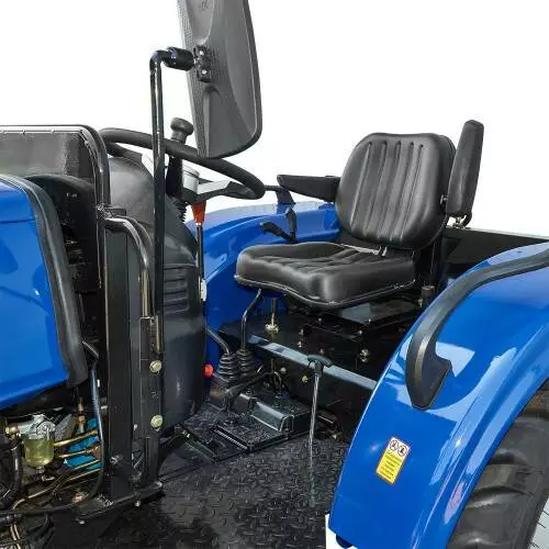 Трактор оснащен механической коробкой передач с двумя диапазонами и формулой (4+1)×2. Это позволяет работать с большой вариативностью скоростей — от 0,39 до 31,97 км/ч. Передний мост отключается вручную, обеспечивая лучшую манёвренность и экономию топлива. Гидрообъёмное рулевое управление с двухсторонним цилиндром и быстрым поворотом, раздельные тормоза и высокий клиренс (390 мм) — всё это способствует уверенному движению на различных типах почвы.