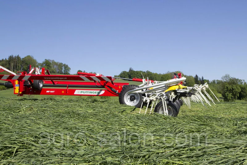 Прицепные ворошилки HIT T компании POTTINGER объединяют в себе высокую производительность с интеллигентной техникой. Обе модели оснащены изысканной кинематикой подъема, что позволяет просто и быстро поднять ворошилку при повороте на краю поля.