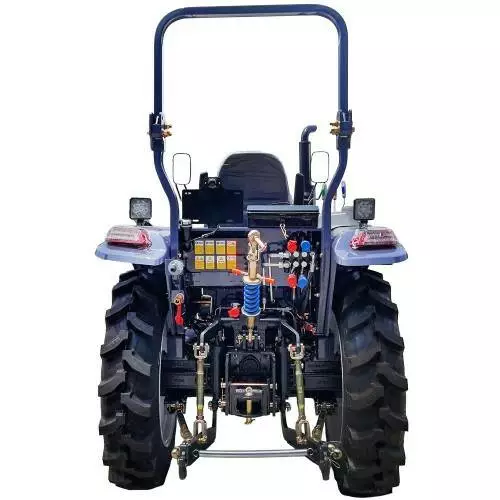 Повний привод (4×4) дає впевненість на будь-якому покритті, від мокрої землі до засніжених стежок. Радіус розвороту становить лише 4,95 м без гальм і 4,5 м із гальмами, тож трактор ідеально підходить для маленьких ділянок. Гідропідсилювач керма з окремим насосом робить керування легким, як у машині, а барабанні гальма з роздільними педалями дозволяють швидко зупинятися чи повертати з точністю.